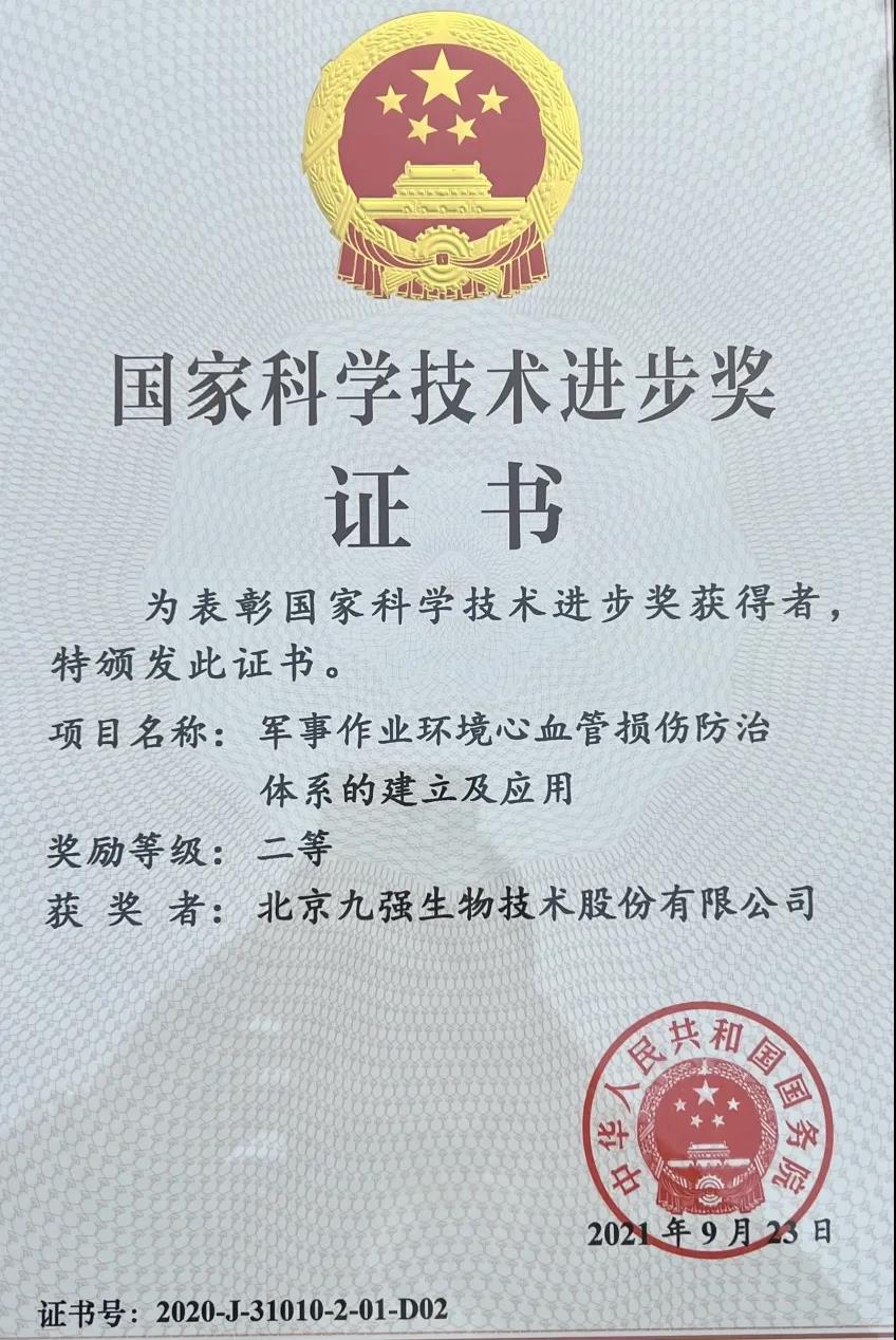 2021年11月3日,2020年度國家科學技術獎勵大會在人民大會堂正式召開。中國人民解放軍總醫(yī)院何昆侖、田亞平兩位教授團隊領銜,與北京九強生物技術股份有限公司共同合作完成的“軍事作業(yè)環(huán)境心血管損傷防治體系的建立及應用”榮獲2020年度國家科技進步二等獎。九強生物總經(jīng)理劉希出席了頒獎現(xiàn)場并領獎。
