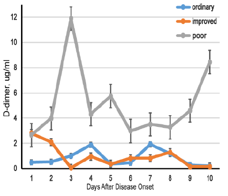 南京醫(yī)科大學(xué)從湖北省三家醫(yī)院招募了279例COVID-19患者進(jìn)行研究,結(jié)果顯示:入院時(shí),改善組和惡化組的D-二聚體水平高于普通組。經(jīng)治療,改善組D-二聚體水平逐漸降低,而惡化組由于病情沒有得到有效控制,D-二聚體仍保持較高水平,說明D-二聚體水平的動(dòng)態(tài)變化與COVID-19的預(yù)后呈現(xiàn)出一定的相關(guān)性[4]。