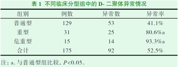 對武漢雷神山醫(yī)院收治的175例成人新型冠狀病毒肺炎患者進(jìn)行研究,以D-二聚體值>0.55mg/L 為異常,結(jié)果表明:重型、危重型患者D-二聚體異常率顯著高于普通型組,且危重型患者D-二聚體水平明顯高于重型和普通型,提示可將D-二聚體作為評價(jià)成人COVID-19的嚴(yán)重性指標(biāo)[6]。