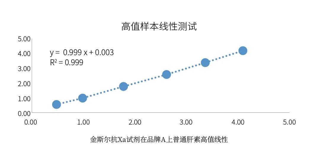 金斯爾抗Xa試劑盒普通肝素線性可以做到4IU/mL,不僅可以滿足說明書所宣稱的1.2IU/mL,同時可以滿足臨床上的一些異常特殊高值樣本的檢測需求。