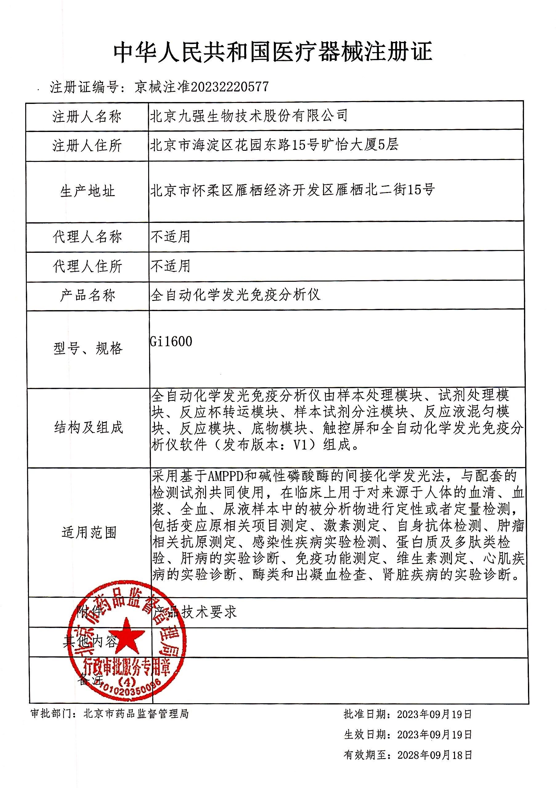 九強生物Gi1600全自動化學(xué)發(fā)光免疫分析儀和Gi2000全自動化學(xué)發(fā)光免疫分析儀順利獲得北京醫(yī)療器械監(jiān)督管理局頒發(fā)的《醫(yī)療器械注冊證》,注冊證號分別為京械注準(zhǔn)20232220577、京械注準(zhǔn)20232220578。
