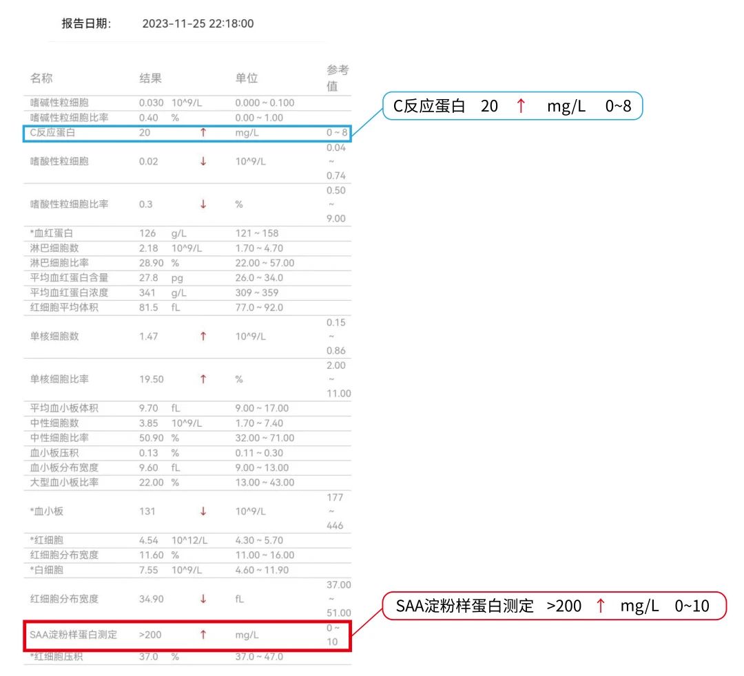 檢測結(jié)果分析:CRP在感染早期未升高,SAA早期升高到參考值上限9倍;隨著病情嚴(yán)重,CRP與SAA均升高,SAA為參考值上限20倍。