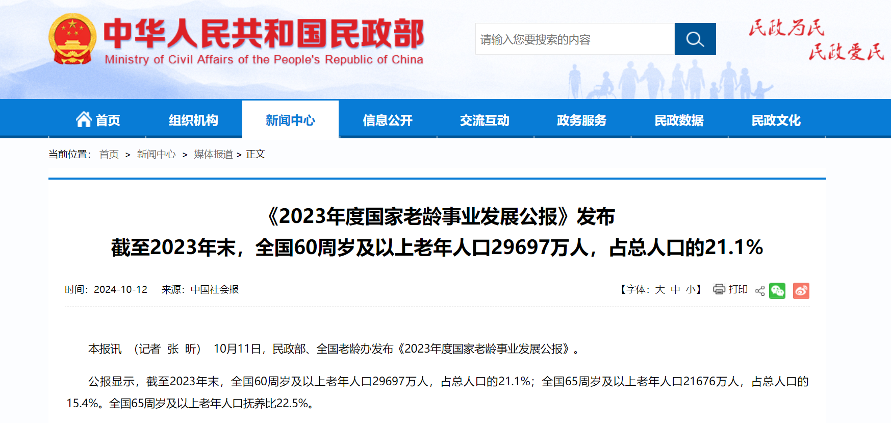 民政部、全國老齡辦11日發(fā)布《2023年度國家老齡事業(yè)發(fā)展公報》。公報顯示,截至2023年末,全國60周歲及以上老年人口29697萬人,占總人口的21.1%。全國65周歲及以上老年人口21676萬人,占總人口的15.4%。全國65周歲及以上老年人口撫養(yǎng)比為22.5%。