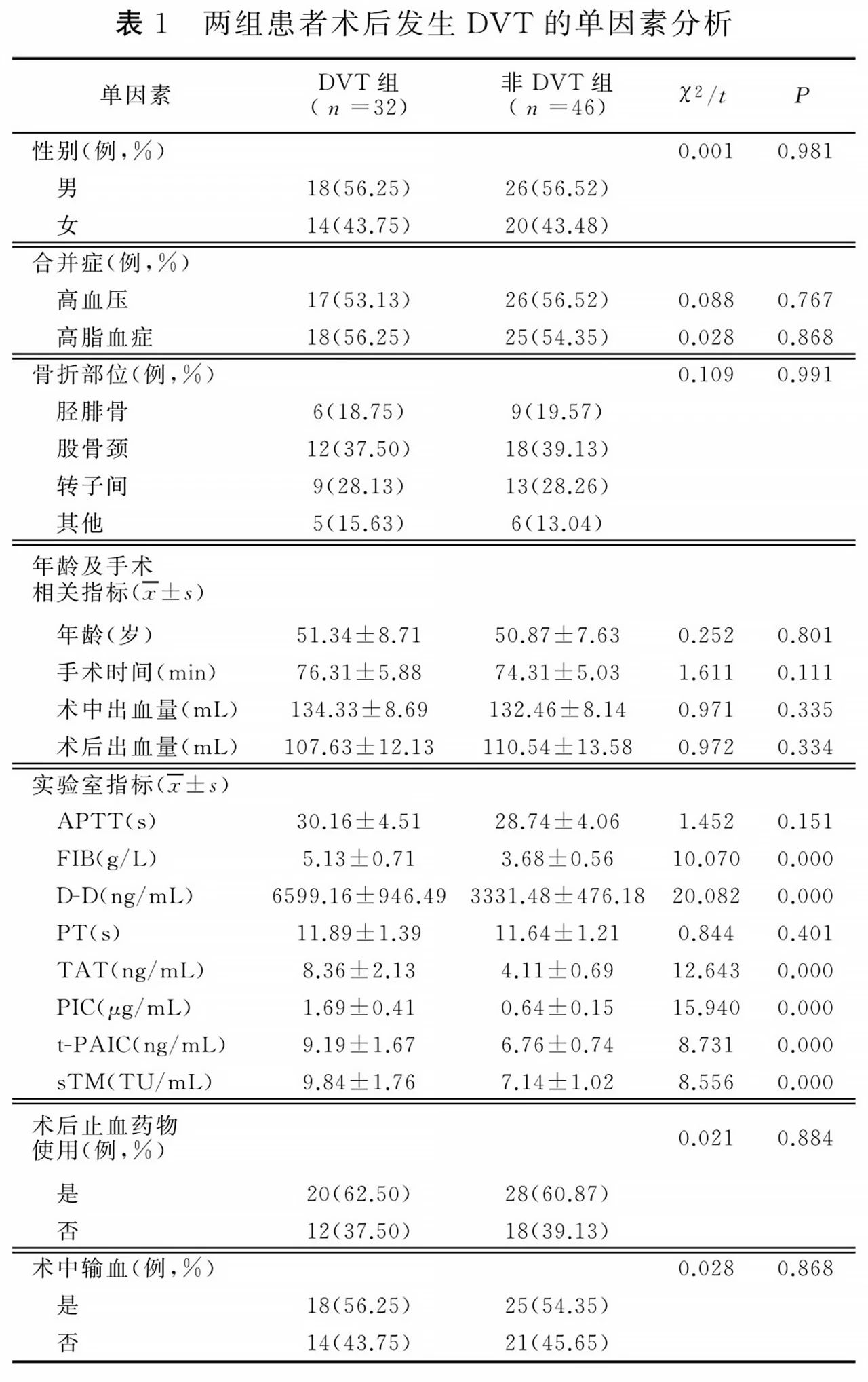 兩組患者性別、年齡、合并癥、骨折部位、手術時間、術中出血量、術后出血量、APTT、PT、術后止血藥物使用、術中輸血比較,差異無統(tǒng)計學意義(P>0.05),DVT組FIB、D-D、TAT 、PIC、t-PAIC、sTM 顯著高于非 DVT組,差異有統(tǒng)計學意義(P<0.05),見表1。