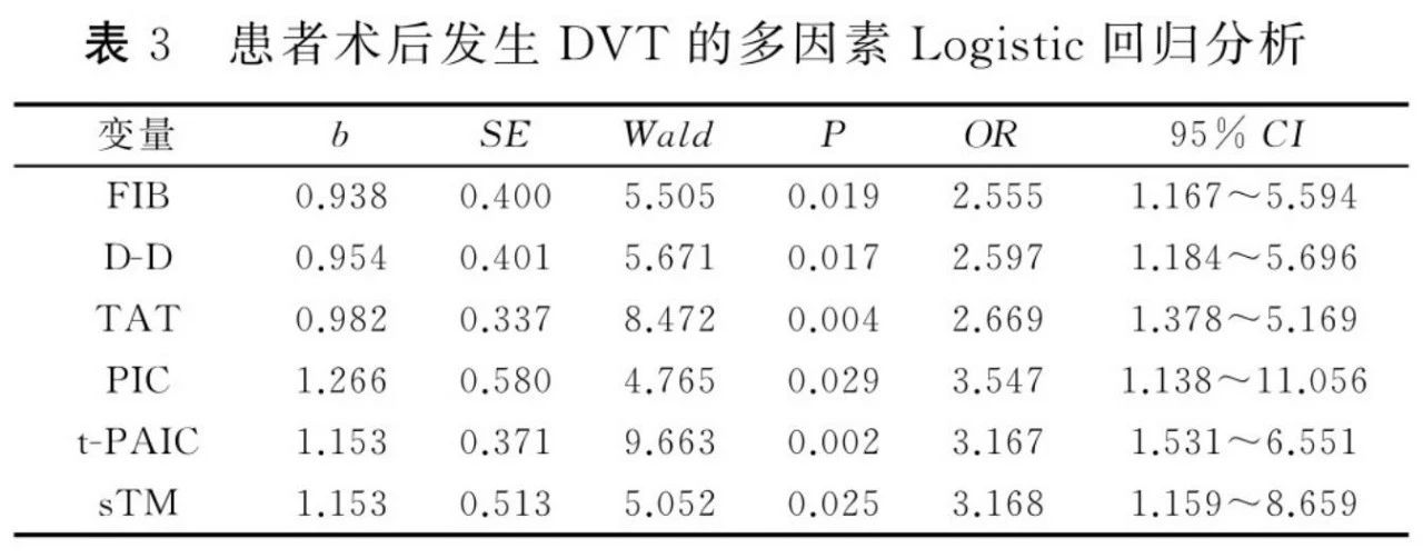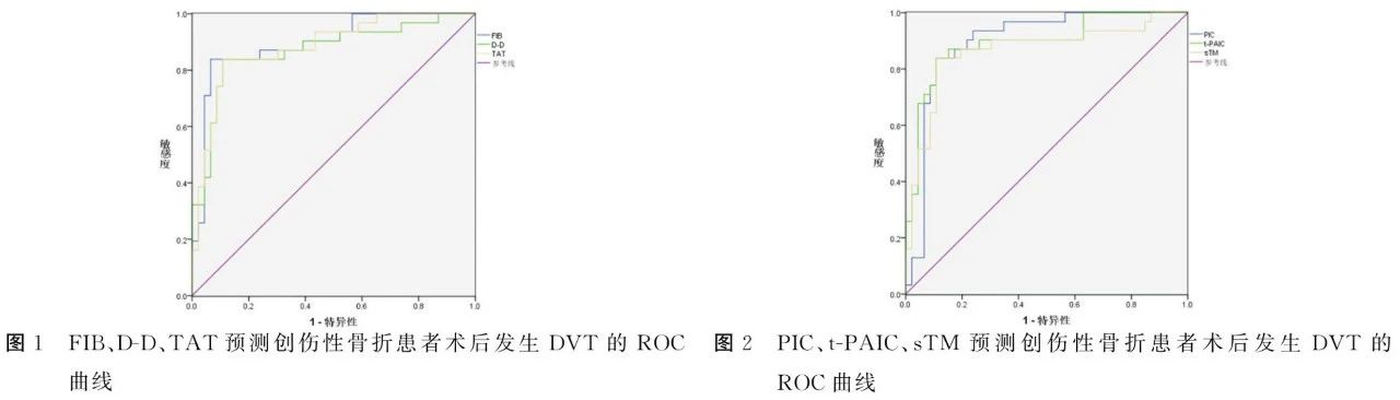 本次研究顯示,DVT組FIB、D-D、TAT、PIC、t-PAIC、sTM 顯著高于非DVT組,提示FIB、D-D、TAT、PIC、t-PAIC、STM可能與創(chuàng)傷性骨折患者術后DVT風險有關。